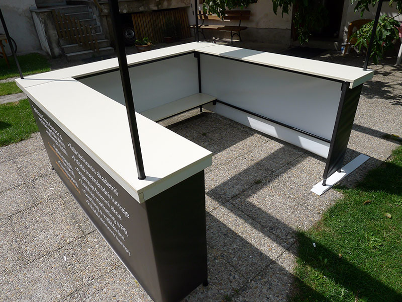Popis stánkuProdejní stánek Salebox je tvořen kovovou konstrukcí, která je opláštěna potištěnou PVC bannerovou plachtou. Spodní část je obrandována ze tří stran, horní část nese reklamní plochy ze všech stran.